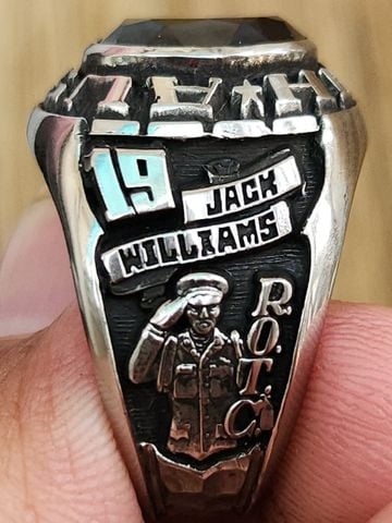 nhẫn mỹ xưa Đại học University Eastern Mennonite - Trên cùng là hột đá tím Amerthys với bề mặt và đáy mài đa giác lấp lánh hoàn hảo. bao quanh hột là tên trường đại học...