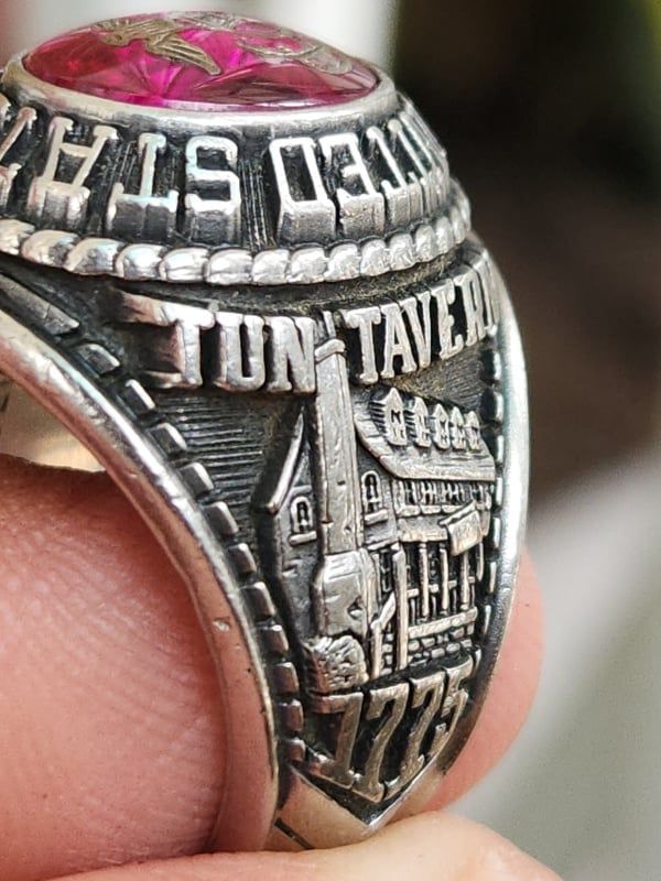 – Bên hông phải nhẫn là hình ảnh tòa nhà Tun Tavenrn nơi thành lập của Quân Đoàn Thủy Quân Lục Chiến 1775.