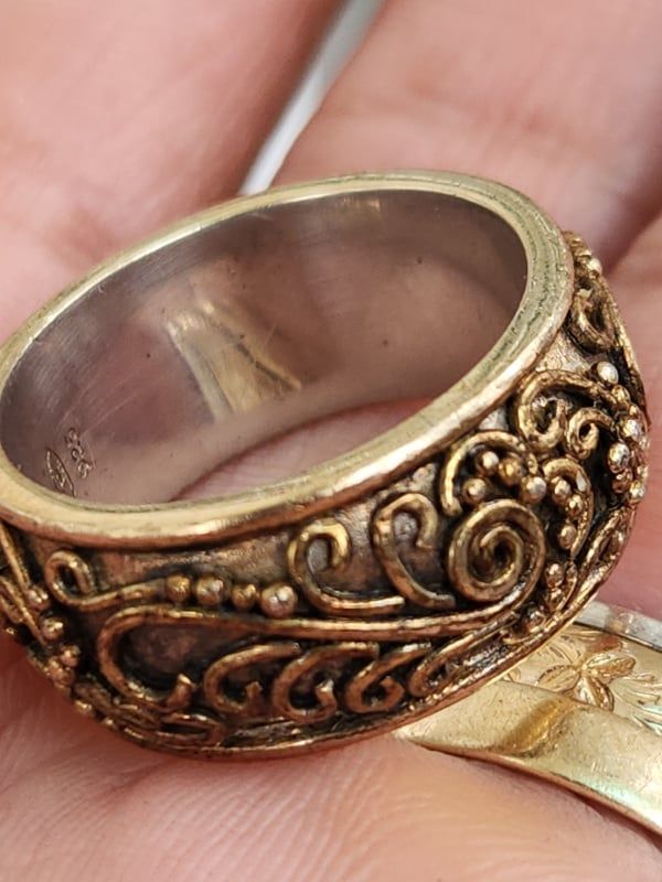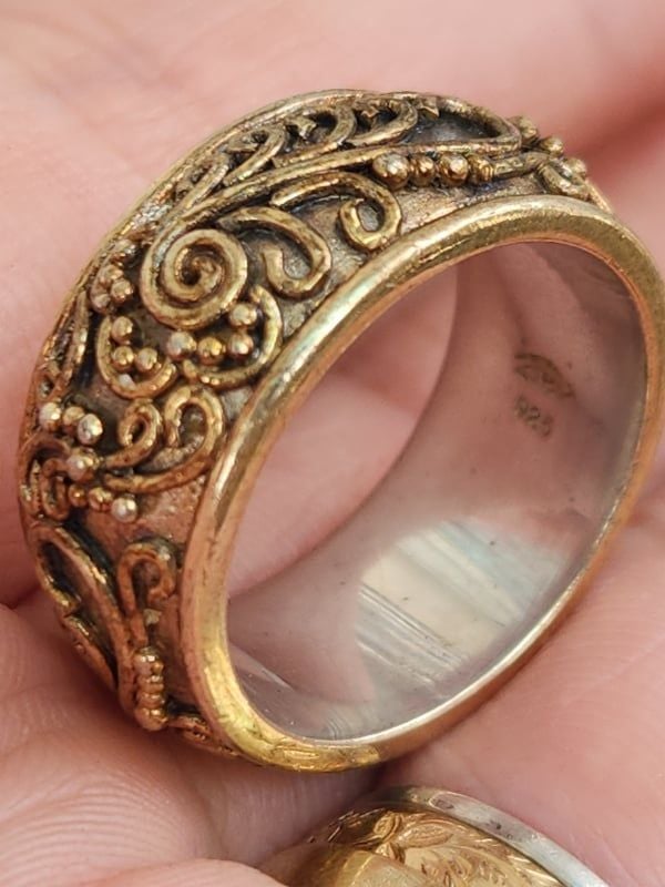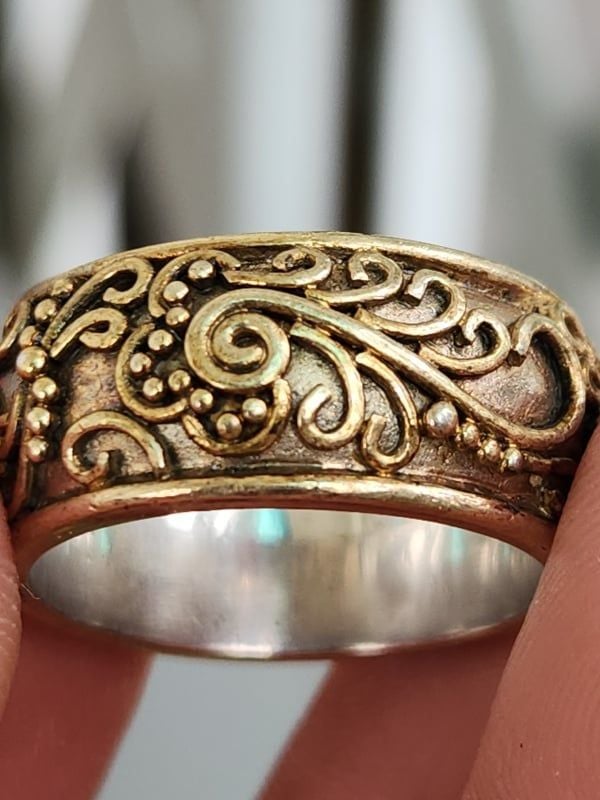 nhẫn mỹ xưa hoa văn hàng hiệu bạc áo vàng 925- nhẫn được thiết kế đeo xoay 360độ thoải mái với nhiều hoa văn hoa lá xem kẽ- lòng nhẫn màu trắng đóng mộc triện...
