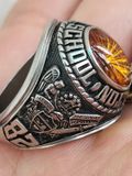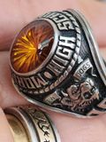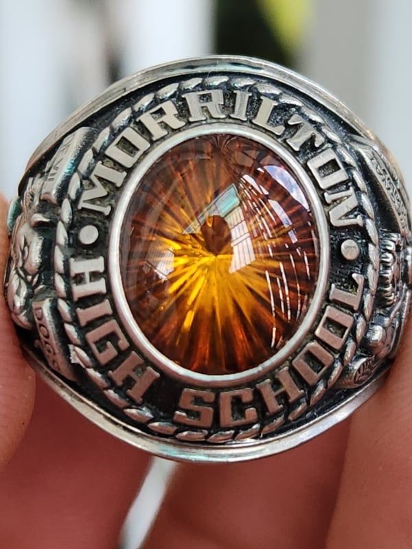 - trên cùng là hột vàng hổ phách Amber với bề mặt láng đáy tia rực rỡ (hột này cực kỳ hiếm gặp, lên tay rất sang và sáng tài), bao quanh hột là tên trường Morrilton High.